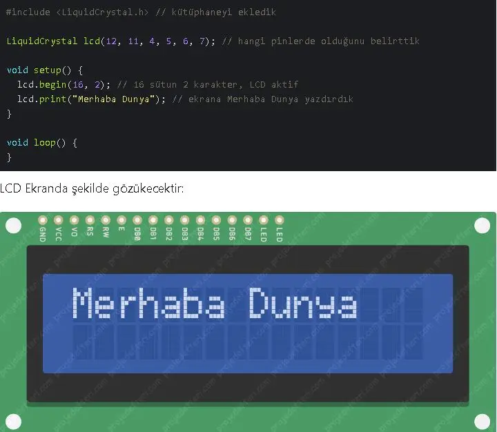2×16 LCD ekran üzerinde Merhaba Dünya yazısı